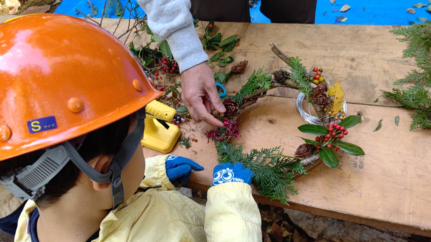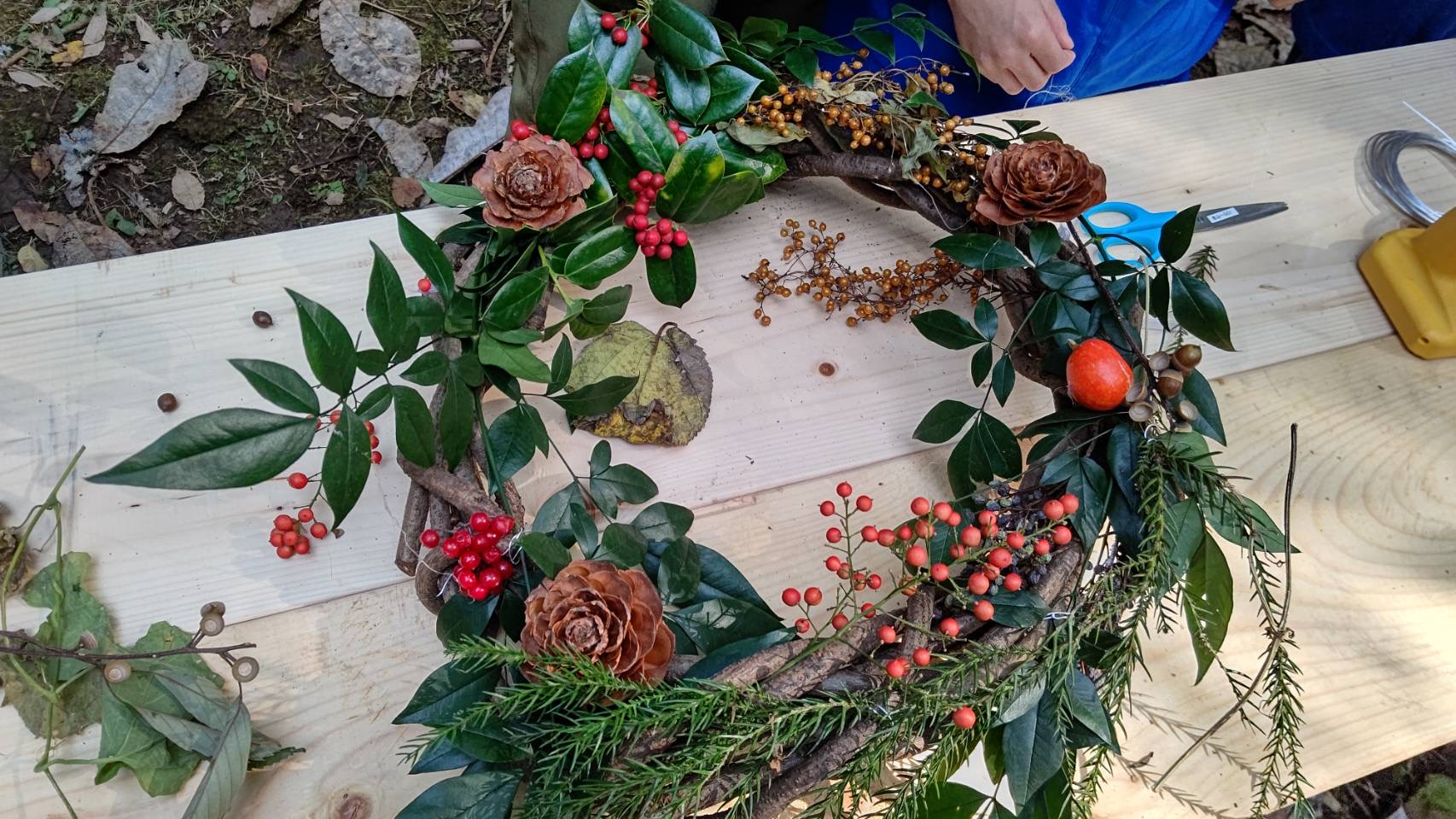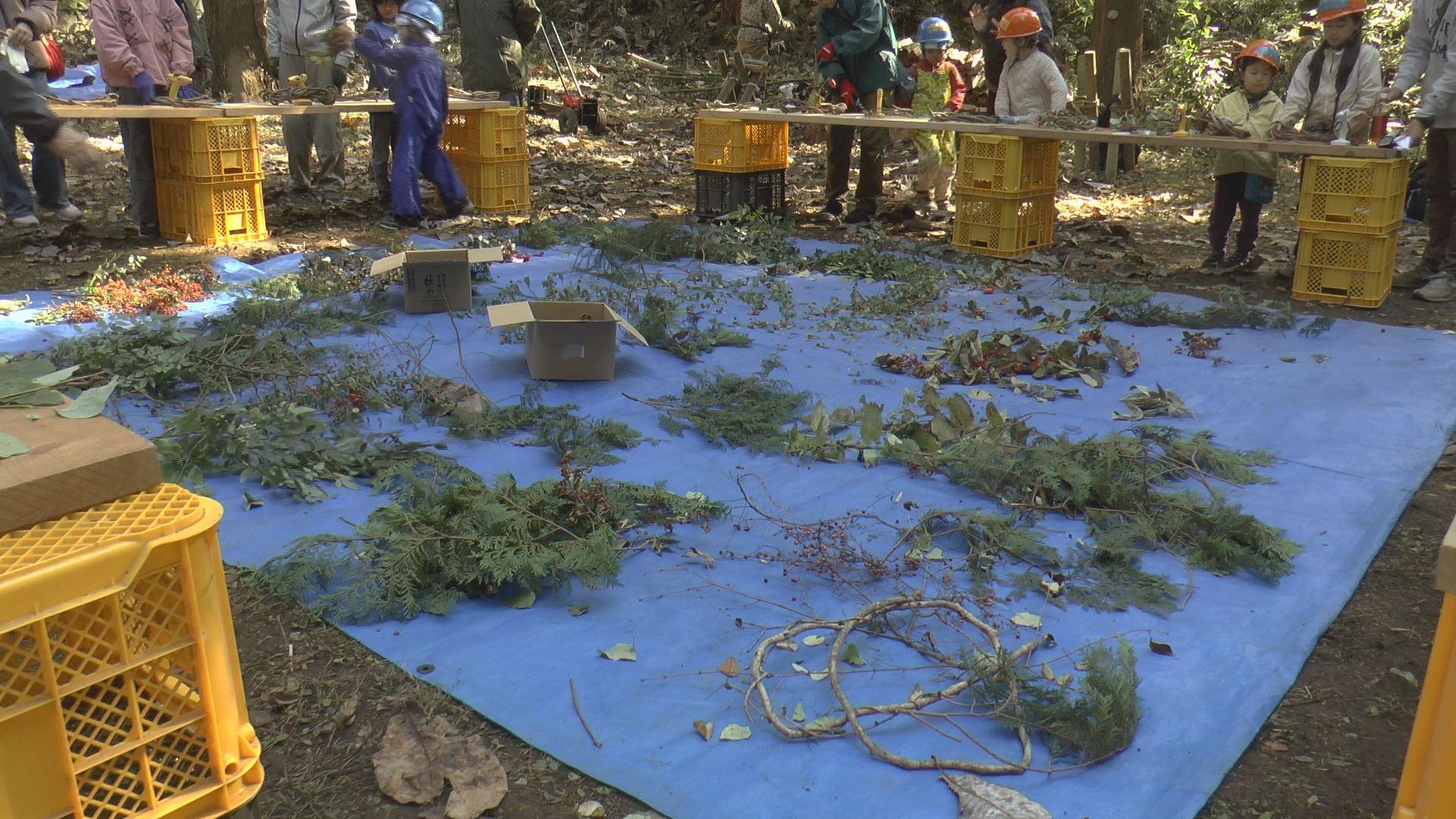 晴天の中、リース作り、自然観察・草刈・樹木の伐採・薪割りなど。 参加された方からは、始めて体験したので楽しい思い出になりました! 是非、来年もリース作りに来たい!との声をいただきました。